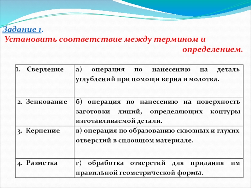 Слайд 5Задание 3. Установить соответствие между видами сверл и их назначением.