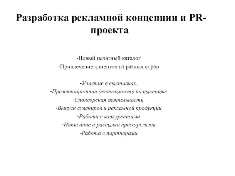 Разработка рекламной концепции и PR-проектаНовый печатный каталогПривлечение клиентов из разных странУчастие в выставках.Презентационная деятельность на выставкеСпонсорская деятельность.Выпуск