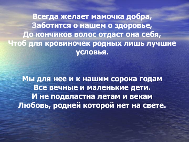 Всегда желает мамочка добра,Заботится о нашем о здоровье,До кончиков волос отдаст она себя, Чтоб для кровиночек родных