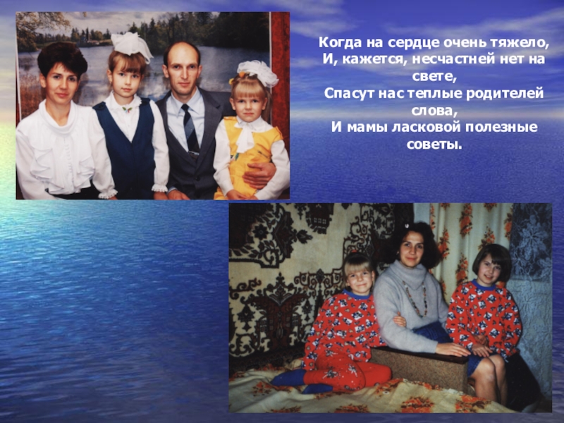 Когда на сердце очень тяжело,И, кажется, несчастней нет на свете,Спасут нас теплые родителей слова,И мамы ласковой полезные