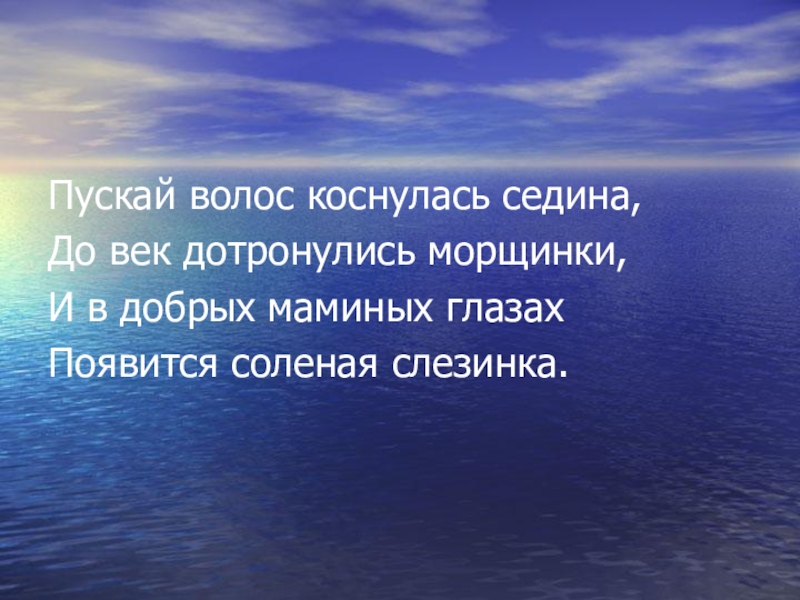 Пускай волос коснулась седина,До век дотронулись морщинки,И в добрых маминых глазахПоявится соленая слезинка.