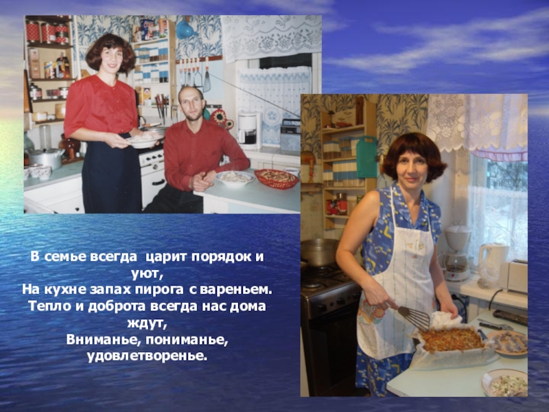 В семье всегда царит порядок и уют,На кухне запах пирога с вареньем.Тепло и доброта всегда нас дома