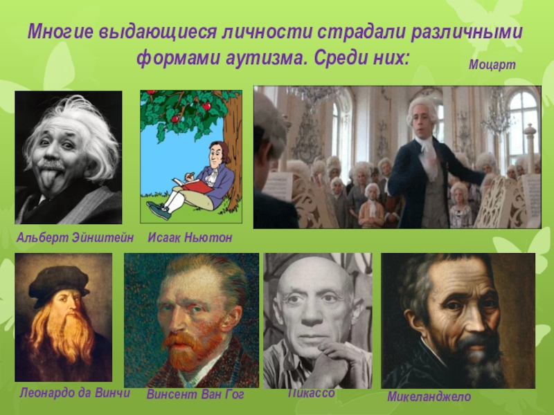 Слайд 16 Многие выдающиеся личности страдали различными формами аутизма. Среди них: