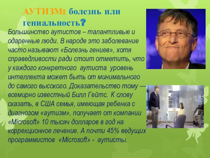 народе это заболевание часто называют «Болезнь гениев», хотя справедливости ради стоит отметить, что у каждого конкретного аутиста уровень интеллекта может быть от минимального до самого высокого. Доказательство тому — всемирно известный Билл Гейтс. К слову сказать, в США семья, имеющая ребенка с диагнозом «аутизм», получает от компании «Microsoft» 10 тысяч долларов в год на коррекционное лечение. А почти 45% ведущих программистов «Microsoft» - аутисты.