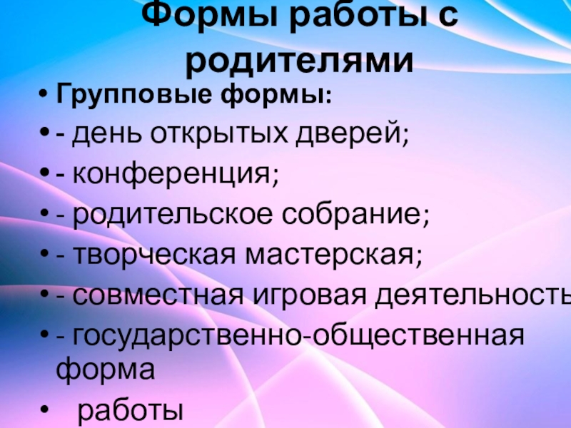 Формы работы с родителямиГрупповые формы:- день открытых дверей;- конференция;- родительское собрание;- творческая мастерская;- совместная игровая деятельность;- государственно-общественная