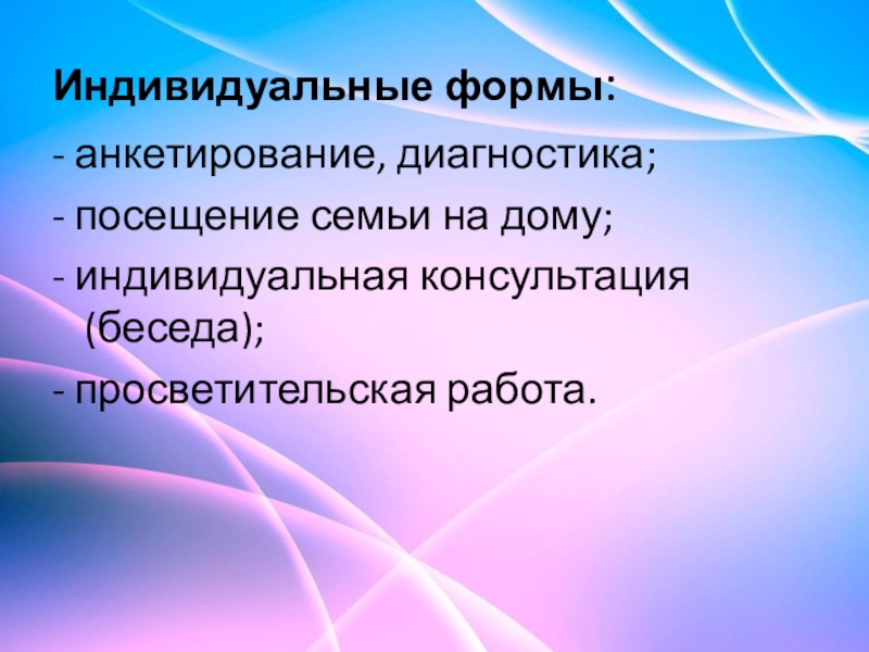 Индивидуальные формы:- анкетирование, диагностика;- посещение семьи на дому;- индивидуальная консультация (беседа);- просветительская работа.