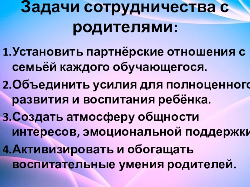 Задачи сотрудничества с родителями: 1.Установить партнёрские отношения с семьёй каждого обучающегося.2.Объединить усилия для полноценного развития и воспитания