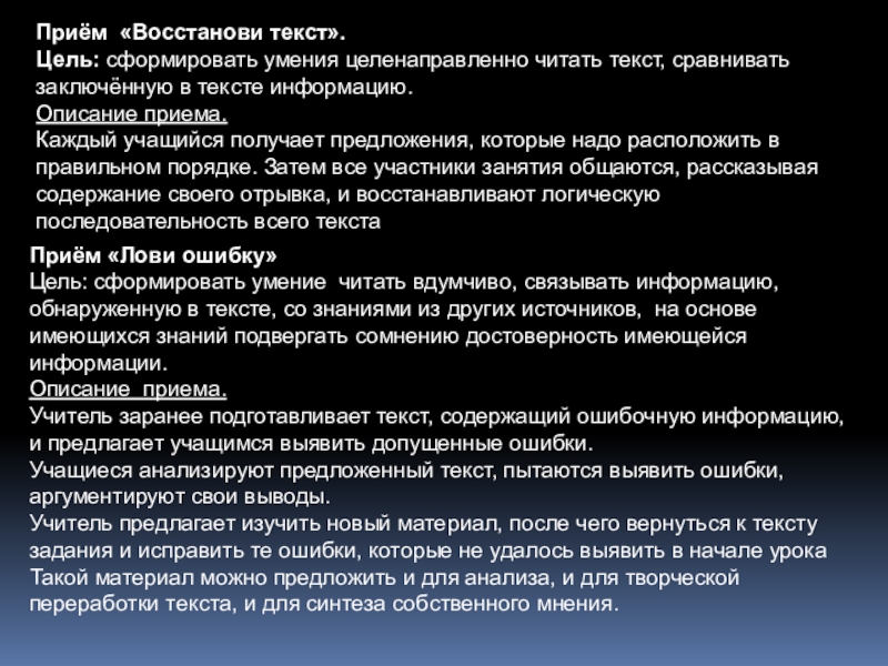 Учитель заранее подготавливает текст, содержащий ошибочную информацию, и предлагает учащимся выявить допущенные ошибки.