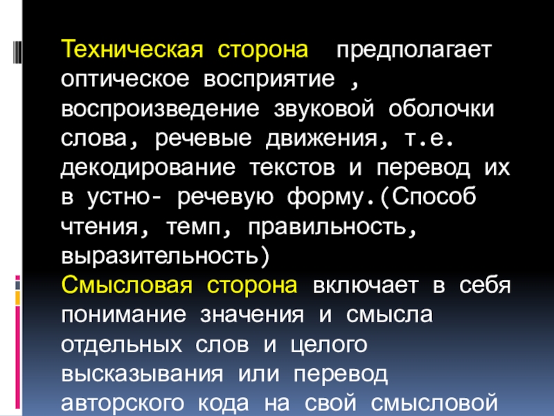 движения, т.е. декодирование текстов и перевод их в устно- речевую форму.(Способ чтения, темп, правильность, выразительность)