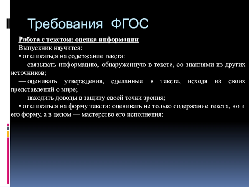 • откликаться на форму текста: оценивать не только содержание текста, но и его форму, а в целом — мастерство его исполнения;