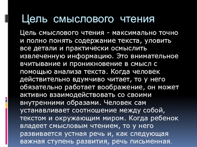 содержание текста, уловить все детали и практически осмыслить извлеченную информацию. Это внимательное вчитывание и проникновение в смысл с помощью анализа текста. Когда человек действительно вдумчиво читает, то у него обязательно работает воображение, он может активно взаимодействовать со своими внутренними образами. Человек сам устанавливает соотношение между собой, текстом и окружающим миром. Когда ребенок владеет смысловым чтением, то у него развивается устная речь и, как следующая важная ступень развития, речь письменная.