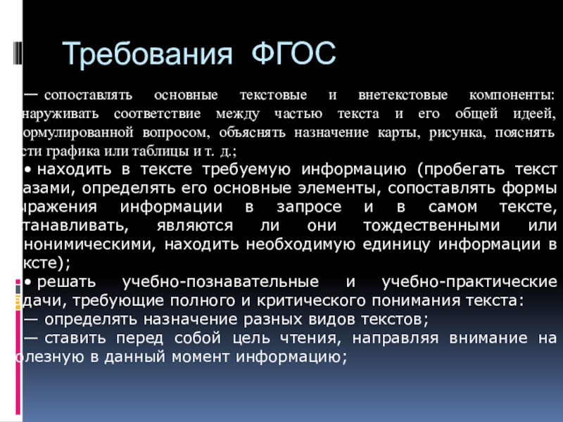 — сопоставлять основные текстовые и внетекстовые компоненты: обнаруживать соответствие между частью