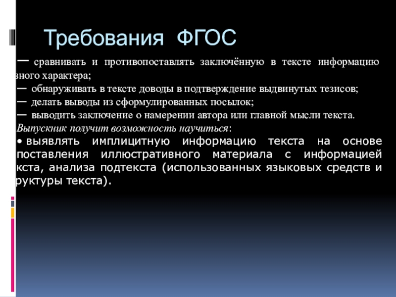 — сравнивать и противопоставлять заключённую в тексте информацию разного характера;