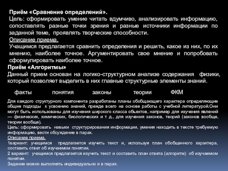 Для каждого структурного компонента разработаны планы обобщающего характера определяющие общие подходы к усвоению знаний, прежде всего на основе работы с учебной литературой.Они могут быть использованы для изучения широкого класса объектов, например для изучения явлений — физических, химических, биологических и т д., для изучения законов, теорий (законов вообще, теории вообще).