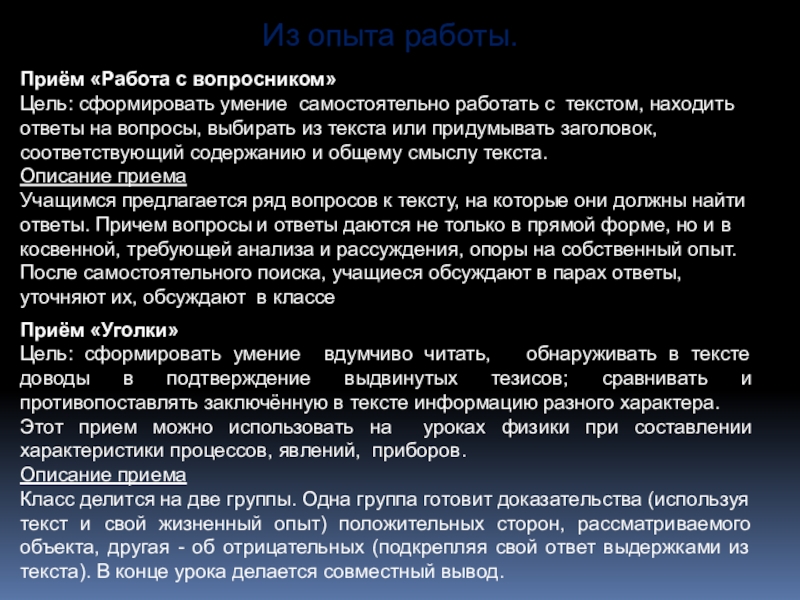 Учащимся предлагается ряд вопросов к тексту, на которые они должны найти ответы. Причем вопросы и ответы даются не только в прямой форме, но и в косвенной, требующей анализа и рассуждения, опоры на собственный опыт. После самостоятельного поиска, учащиеся обсуждают в парах ответы, уточняют их, обсуждают в классе