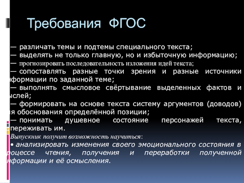 • анализировать изменения своего эмоционального состояния в процессе чтения, получения и переработки полученной информации и её осмысления.