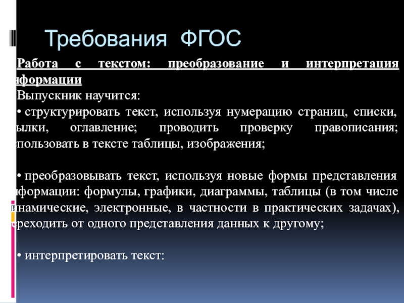 • преобразовывать текст, используя новые формы представления информации: формулы, графики, диаграммы, таблицы (в том числе динамические, электронные, в частности в практических задачах), переходить от одного представления данных к другому;