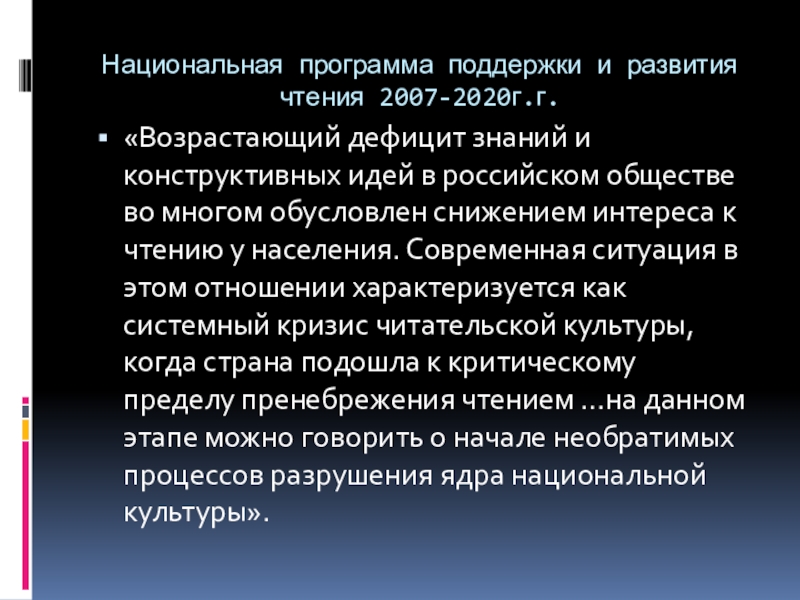 «Возрастающий дефицит знаний и конструктивных идей в российском обществе во многом обусловлен снижением интереса к чтению у населения. Современная ситуация в этом отношении характеризуется как системный кризис читательской культуры, когда страна подошла к критическому пределу пренебрежения чтением …на данном этапе можно говорить о начале необратимых процессов разрушения ядра национальной культуры».