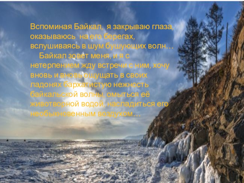 Слайд 12Вспоминая Байкал, я закрываю глаза, оказываюсь на его берегах, вслушиваясь в