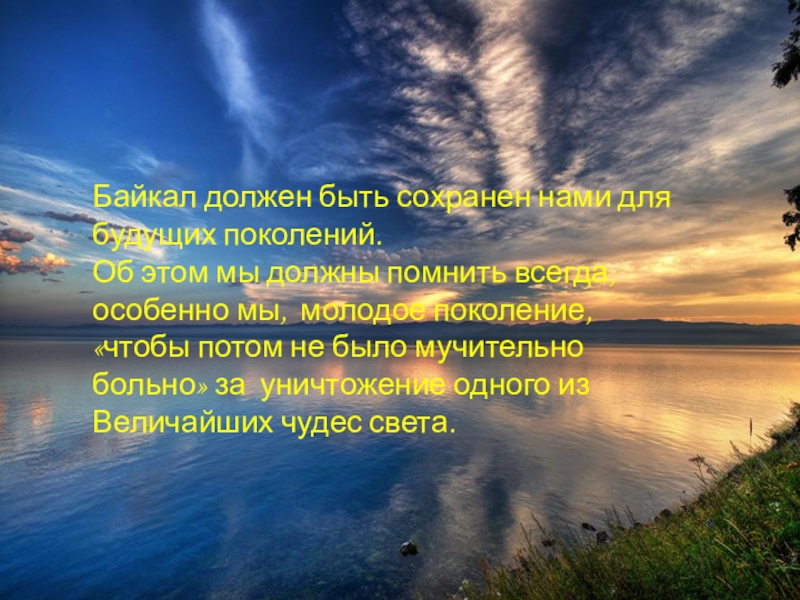 Слайд 14Байкал должен быть сохранен нами для будущих поколений.