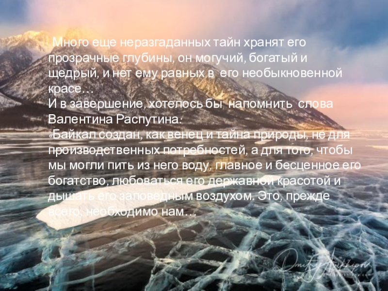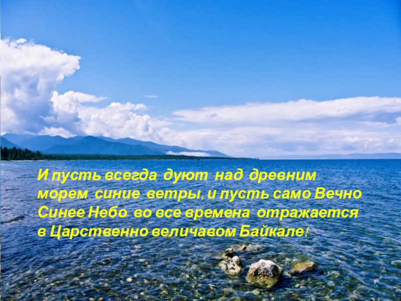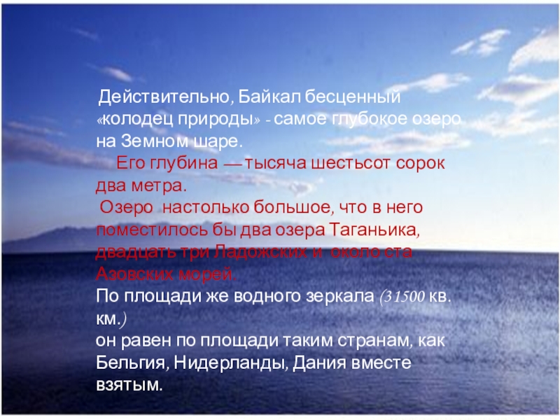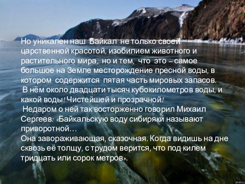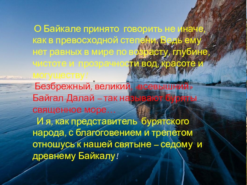 Слайд 5 О Байкале принято говорить не иначе, как в превосходной степени.