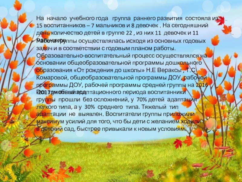 Все три этапа адаптационного периода воспитанники группы прошли без осложнений, у 70% детей адаптация легкого типа, а у 30% среднего типа. Тяжелый тип адаптации не выявлен. Воспитатели группы приложили максимум усилий для того, что бы дети с желанием ходили в детский сад, быстрее привыкали к новым условиям.