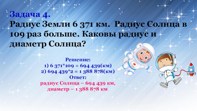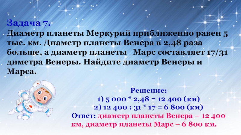Ответ: диаметр планеты Венера – 12 400 км, диаметр планеты Марс – 6 800 км.