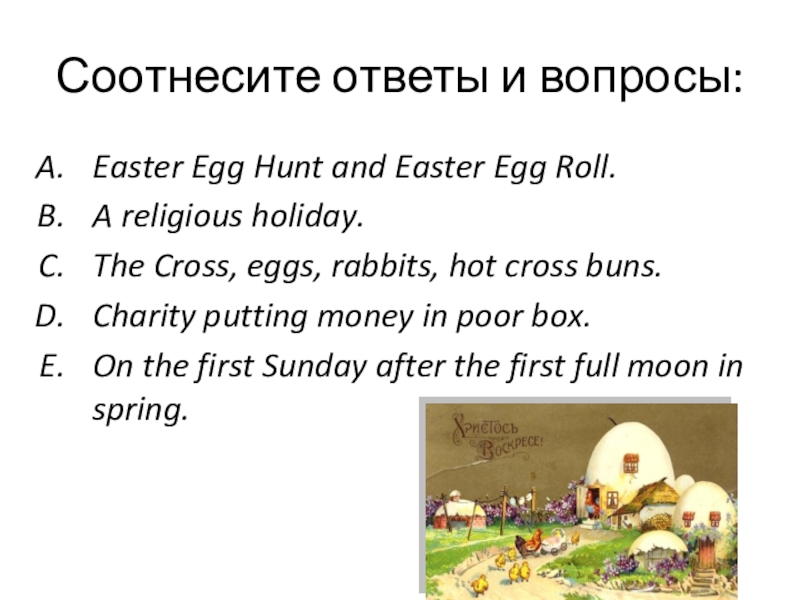 Соотнесите ответы и вопросы:Easter Egg Hunt and Easter Egg Roll.A religious holiday.The Cross, eggs, rabbits, hot cross