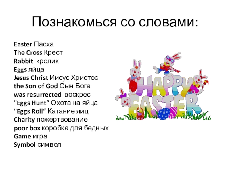 Познакомься со словами:Easter ПасхаThe Cross КрестRabbit кроликEggs яйца  Jesus Christ Иисус Христосthe Son of God Сын