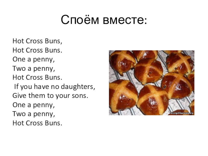 Споём вместе:Hot Cross Buns,Hot Cross Buns.One a penny,Two a penny,Hot Cross Buns. If you have no daughters,Give