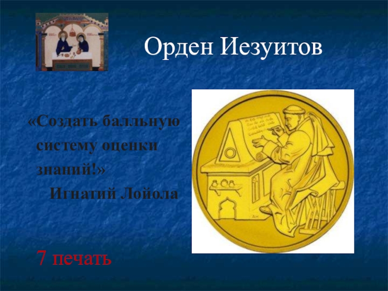 Орден Иезуитов  «Создать балльную  систему оценки  знаний!»