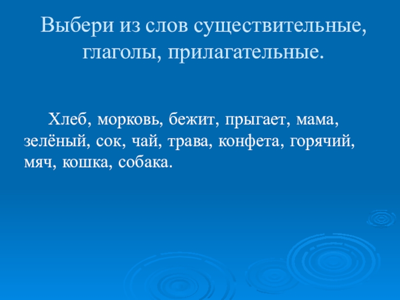 Выбери из слов существительные, глаголы, прилагательные.   Хлеб, морковь, бежит, прыгает, мама, зелёный, сок, чай, трава,