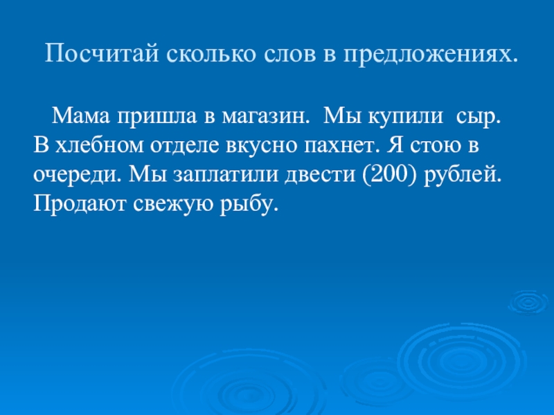 Посчитай сколько слов в предложениях.  Мама пришла в магазин. Мы купили сыр. В хлебном отделе вкусно