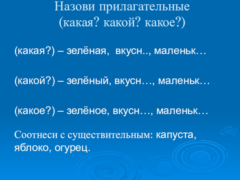 Назови прилагательные  (какая? какой? какое?) (какая?) – зелёная, вкусн.., маленьк…(какой?) – зелёный, вкусн…, маленьк…(какое?) – зелёное,