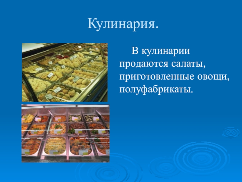 Кулинария.  В кулинарии продаются салаты, приготовленные овощи, полуфабрикаты.