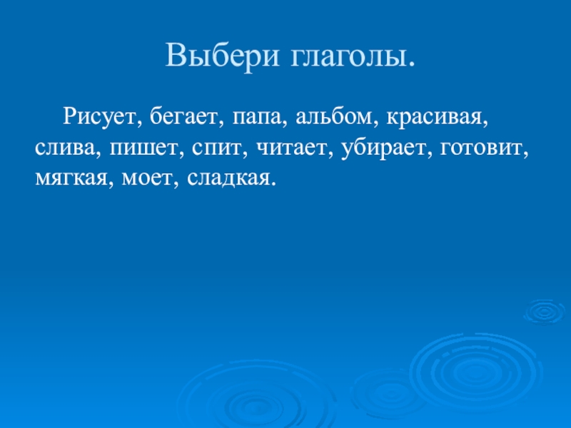 Выбери глаголы.  Рисует, бегает, папа, альбом, красивая, слива, пишет, спит, читает, убирает, готовит, мягкая, моет, сладкая.