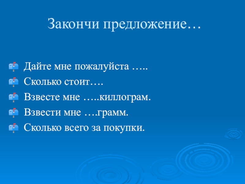 Закончи предложение…Дайте мне пожалуйста …..Сколько стоит….Взвесте мне …..киллограм.Взвести мне ….грамм.Сколько всего за покупки.