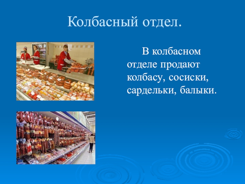 Колбасный отдел.   В колбасном отделе продают колбасу, сосиски, сардельки, балыки.