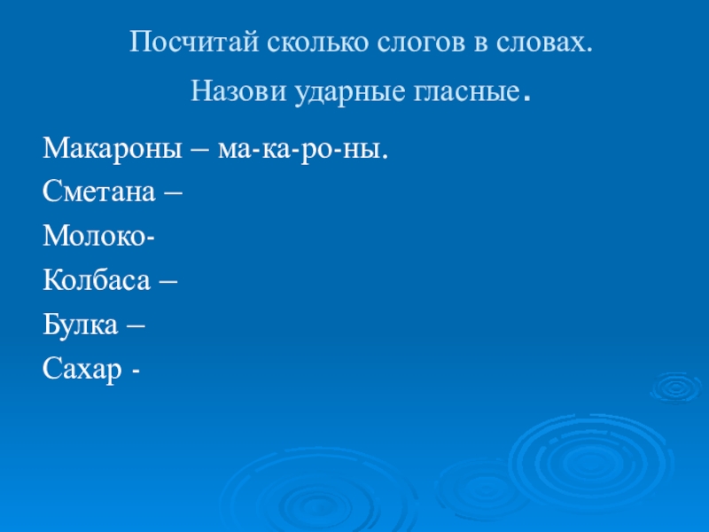 Посчитай сколько слогов в словах.  Назови ударные гласные.Макароны – ма-ка-ро-ны.Сметана – Молоко-Колбаса – Булка – Сахар