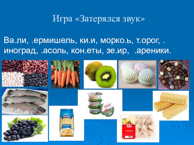 Игра «Затерялся звук»Ва.ли, .ермишель, ки.и, морко.ь, т.орог, .иноград, .асоль, кон.еты, зе.ир, .ареники.