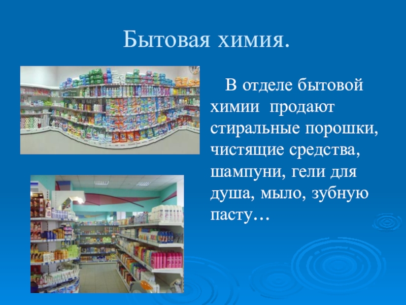 Бытовая химия.  В отделе бытовой химии продают стиральные порошки, чистящие средства, шампуни, гели для душа, мыло,