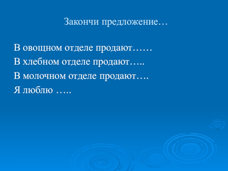 Закончи предложение…В овощном отделе продают……В хлебном отделе продают…..В молочном отделе продают….Я люблю …..