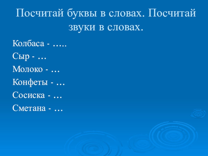 Посчитай буквы в словах. Посчитай звуки в словах.Колбаса - …..Сыр - …Молоко - …Конфеты - …Сосиска -