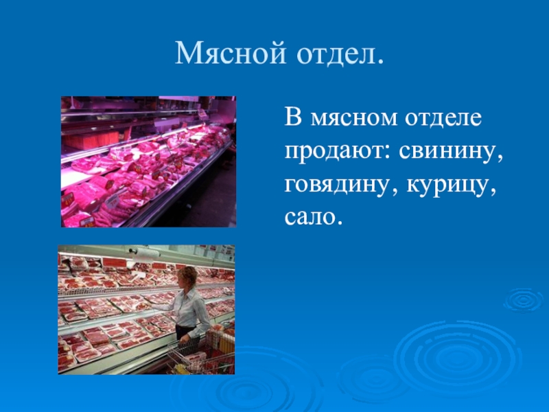 Мясной отдел.В мясном отделе продают: свинину, говядину, курицу, сало.