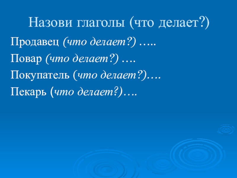 Назови глаголы (что делает?)Продавец (что делает?) …..Повар (что делает?) ….Покупатель (что делает?)….Пекарь (что делает?)….