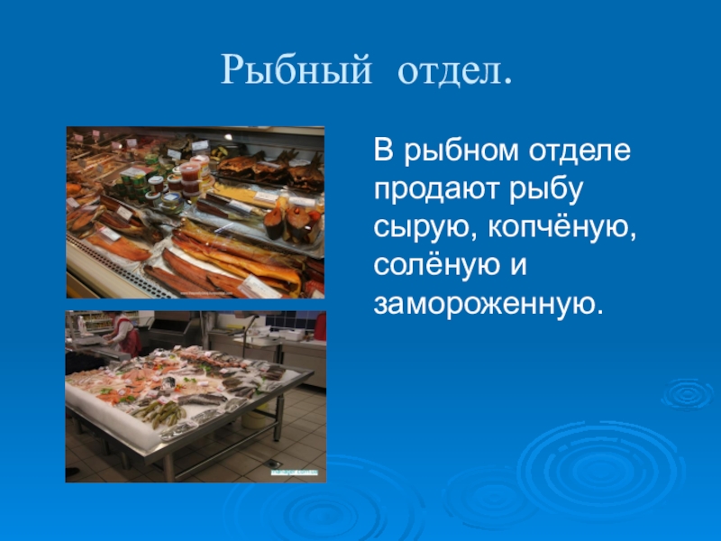В рыбном отделе продают рыбу сырую, копчёную, солёную и замороженную.