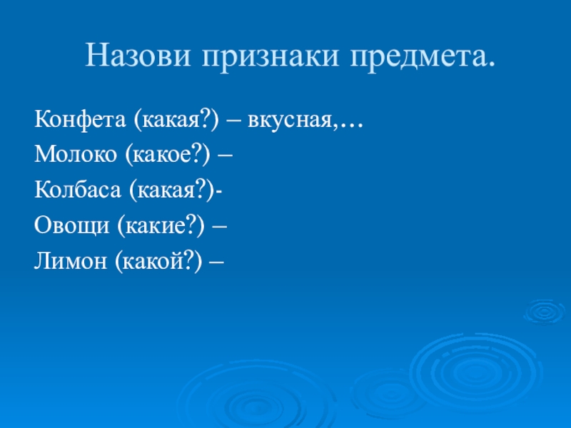 Назови признаки предмета.Конфета (какая?) – вкусная,…Молоко (какое?) – Колбаса (какая?)-Овощи (какие?) – Лимон (какой?) –