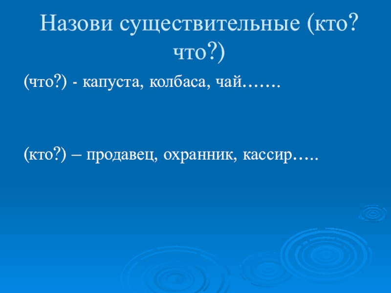Назови существительные (кто? что?)(что?) - капуста, колбаса, чай…….(кто?) – продавец, охранник, кассир…..