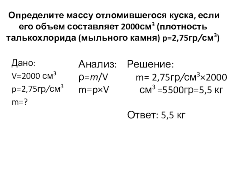 m= 2,75гр/см3×2000 см3 =5500гр=5,5 кг