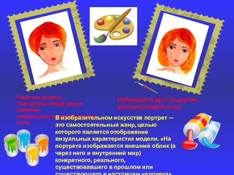 В изобразительном искусстве портрет — это самостоятельный жанр, целью которого является отображение визуальных характеристик модели. «На портрете изображается внешний облик (а через него и внутренний мир) конкретного, реального, существовавшего в прошлом или существующего в настоящем человека».
